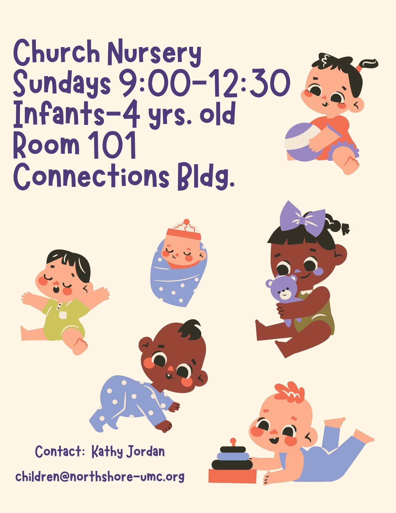 Our Church Nursery is open on Sundays from 9:00 AM to 12:30 PM in Room 101 of the Connections Building. We welcome all children ages 4 and under to join us, providing a safe and nurturing environment for your little ones. If you prefer to keep your child with you during the service, we offer fun and engaging Wiggler Packs, filled with activities, available in the back of the worship center. For more information, please contact Kathy Jordan at children@northshore-umc.org. We look forward to serving your family!